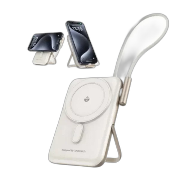 Choetech B735 10000mAh 20W MagLeap Wireless Power Bank White with Phone Holder & Build-in Cable Wired + Wireless Compact 2-in-1 DesignCompact 2-in-1 Design Optional charging methods for you, Both supports charging phones through wire or wireless way.Charge 3x Faster with Wired ChargingBuilt-in USB-C cable, provides 18W of power, Charge your phone three times faster, cable also can be used as a hanging rope and taken anywhere.Fold, Stand and Use. Truely Practical Power Digital Display Worry-free ChargingThe LED display shows the battery level, making it convenient to monitor the power level at any time.Large Capacity in Mini BodyUp to 10000mAh large capacity to satisfy your daily demands for charging.